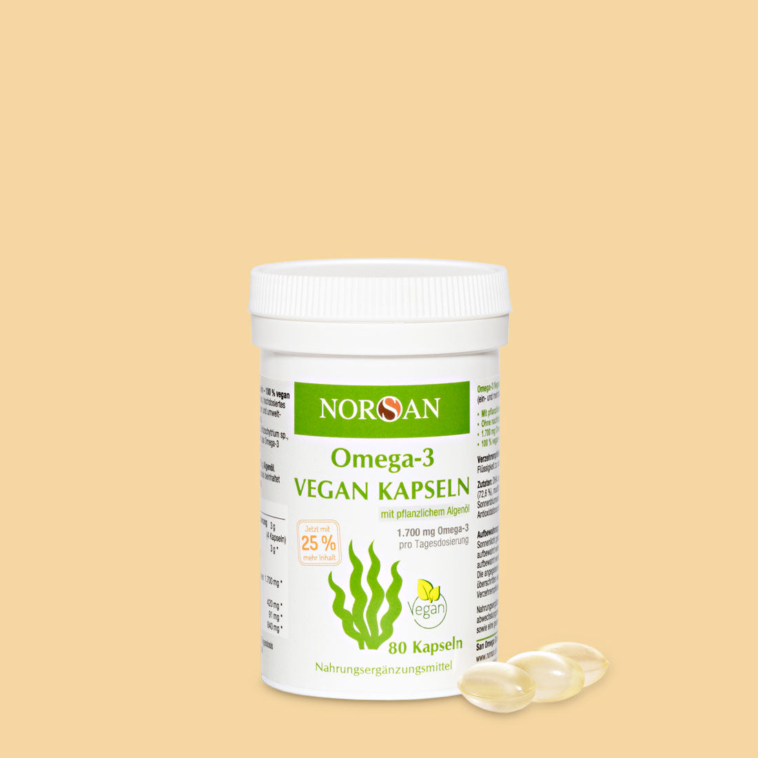 Die Omega-3 Vegan Kapseln (80 Stück) beinhalten ein pflanzliches Algenöl und sind zu 100 % vegan. Das enthaltene Algenöl ist umweltschonend kultiviert . Mit nur einer Tagesdosierung von 3 Kapseln nehmen Sie 1.700 mg marine Omega-3-Fettsäuren auf. Somit sind die veganen Omega-3 Kapseln ein optimaler mariner Omega-3 Lieferant für alle, die sich frei von tierischen Lebensmitteln ernähren möchten.
